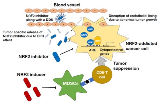 Therapeutic strategies to control NRF2-addicted cancers. NRF2 activation in myeloid-derived suppressor cells (MDSCs) leads to a decrease in reactive oxygen species (ROS) and IL-6 levels and contributes to the maintenance of CD8+ T cell activity. Hence, using NRF2 inducers in the tumor microenvironment is a rational approach to control NRF2-addicted cancer. In contrast, in the tumor itself, NRF2 inhibitors help suppress tumor growth and metastasis by decreasing NRF2 protein levels. However, problems posed by systemic NRF2 inhibition can be prevented by using NRF2 inhibitors in an elaborate drug delivery system designed to achieve high cancer tissue specificity through the enhanced permeability and retention (EPR) effect.