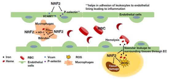 NRF2 plays multifarious roles in the sickle cell disease. NRF2 activation in macrophages contributes to increased HO-1 levels. This increase in HO-1 leads to the breakdown of hemolysis-induced release of free heme into less toxic byproducts. Increased NRF2 levels in endothelial cells help maintain vascular integrity and prevent vascular leakage into surrounding tissues. In addition, P-selectin and VCAM1 levels are also regulated by NRF2 in endothelial cells. This change in P-selectin and VCAM1 levels reduces the adhesion of leukocytes to the endothelial lining, decreasing inflammation and vaso-occlusion.