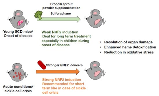 SFN is an interesting NRF2 activator, especially in the case of a malady, such as SCD (Figure 9). Since SFN is a phytonutrient available as a food supplement that induces mild NRF2 activation and because SCD is evident at a young age, SFN is well suited to be a long-term treatment regimen for children [23]. In fact, a phase 1 study of an SFN-containing broccoli sprout homogenate (BSH) was tested in patients with SCD, and the results showed that BSH was tolerated in the adults and did not cause deleterious side effects [106]. High expression levels of NRF2 targeting the gene HMOX1 have been reported in cases of SFN administration. In acute illness, however, as in the case of sickle cell crisis, short-term administration of a stronger water-soluble NRF2 inducer administered intravenously is a better option (Figure 9).