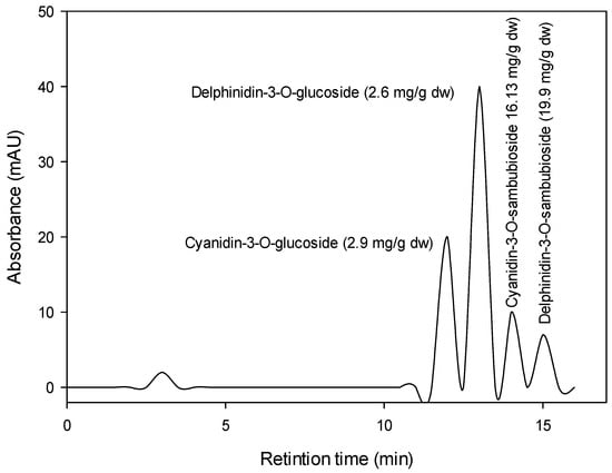 The high-performance liquid chromatography (HPLC) analysis was conducted according to Durst and Wrolstad [36]. Freeze-dried extract in the amount of 10 mg was dissolved with 5 mL of methanol. The Sample was centrifuged at 5000× g for 5 min, and the supernatant was collected and filtered through a Millipore membrane (0.45 µm). The filtrate was twice diluted with purified distilled water. The analyses were performed on an HPLC (Agilent, Santa Clara, CA, USA) model-LC 1100 series, equipped with a degasser, an autosampler automatic injector, a high-pressure pump, and a UV/Visible detector at multiple wavelengths wave. HPLC experiments were conducted using a reversed-phase C18 column (Prontosil, 250 × 4.0 mm, 5 µm, (Bischoff, Roseville, CA, USA). The mobile phase used was a binary gradient eluent (solvent A, 0.1% trifluoroacetic acid in water; solvent B, 0.1% trifluoroacetic acid in acetonitrile). Acetonitrile used was of HPLC grade (Sigma/Aldrich, Burlington, MA, USA) and was degassed in an ultrasonic bath before use. The water was distilled using a Milli-Q system (Millipore, Sigma/Aldrich, Burlington, MA, USA). The elution program was 5–20% B (0–5 min), 20–35% B (5–10 min), 35–100% B (10–25 min), and 100% B (25–40 min) with a flow rate of 0.8 mL·min−1. The chromatograms were monitored at 521 nm.