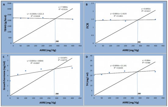 As shown in Table 7, the serum T4 level was linearly higher in the ARRE200 group (p < 0.01). The serum level of growth hormone was linearly and quadratically increased in a level-dependent manner, where the highest levels were observed in ARRE200 and ARRE400 groups (p < 0.05). The serum levels of glucose, leptin, AST, ALT, creatinine, and urea were not significantly different between all groups (p > 0.05). According to the broken-line regression analysis, the optimum inclusion level of ARRE was 280 mg Kg−1 based on the data of total body weight gain, feed conversion ratio, growth hormone, and T4 levels (Figure 4).
