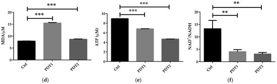 To further to explore the mechanism underlying the effect of ALA_PDT on M. abscessus, we compared the related parameters in the Ctrl, PDT1 and PDT2, such as Fe2+ content, ROS level, DNA damage, lipid peroxidation, ATP amount and NAD+/NADH ratio. The results demonstrated that PDT1 and PDT2 significantly increased the Fe2+ content (Figure 2a), ROS level (Figure 2b), DNA damage (Figure 2c) and lipid peroxidation (Figure 2d) in the bacteria than the Ctrl. PDT lowered the ATP content (Figure 2e) and the NAD+/NADH ratio compared to control bacteria (Figure 2f). The data indicated that ALA_PDT might promote a ferroptosis-like death of M. abscessus by modulate the ferroptosis-related molecules.