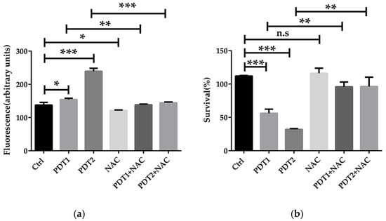 Ctrl, PDT1, PDT2, PDT1 + NAC, PDT2 + NAC, PDT1 + Fer-1, PDT2 + Fer-1 (Ctrl: 0 µg/mL ALA + 0 J/cm2 light, PDT1: 100 µg/mL ALA + 80 J/cm2 light, PDT2: 100 µg/mL ALA + 160 J/cm2 light, PDT1 + NAC: 100 µg/Ml ALA + 80 J/cm2 light + 10 mM NAC, PDT2 + NAC: 100 µg/mL ALA + 160 J/cm2 light + 10 mM NAC, PDT1 + Fer-1: 100 µg/mL ALA + 80 J/cm2 light + 20 µM Ferrostatin-1, PDT2 + Fer-1: 100 µg/mL ALA + 160 J/cm2 light + 20 µM Ferrostatin-1) were centrifuged at 6800× g 10 min, the pellet was washed with 1×PBS 3 times, the OD600 was adjusted to about 0.4 and the ROS level was measured with a ROS Assay kit (Beyotime, Shanghai, China).