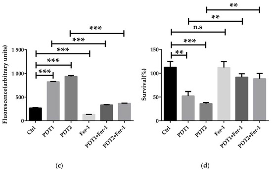 To confirm the role of ferroptosis-like death in ALA_PDT effect on M. abscessus, ROS scavenger NAC and ferroptosis inhibitor Fer-1 were added before ALA_PDT. The antioxidant effect of NAC is mainly to quench ROS. Anti-ferroptotic activity of fer-1 is actually due to the scavenging of initiating alkoxyl radicals produced by Fe2+ from lipid hydroperoxides [37]. The results demonstrated that NAC decreased the production of ROS and rescued M. abscessus from death by ALA_PDT (Figure 3a,b), indicating that ALA_PDT played a role in the death of M. abscessus through the production of ROS. Fer-1 treatment can also reduce the production of ROS and bacteria killing by ALA_PDT (Figure 3c,d). The results demonstrated that ALA_PDT promoted M. abscessus ferroptosis-like death, not only via increasing the production of ROS, but also related to the change of the Fe2+ concentration in the bacteria.