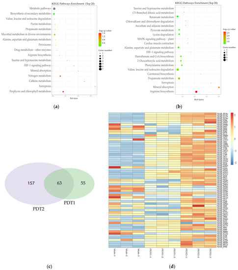 Transcriptome change of M. abscessus upon ALA_PDT. (a) Transcriptome KEGG pathway enrichment analysis of Ctrl and PDT1. (b) Transcriptome KEGG pathway enrichment analysis of Ctrl and PDT2. (c) Venn diagram of PDT1 and PDT2; the number of genes that change in the transcriptome of M. abscessus. (d) Heat map of related genes that change together in the transcriptome of Ctrl, PDT1 and PDT2.