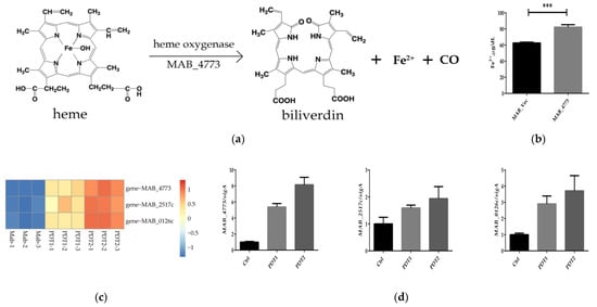 MAB_4773 affects iron metabolism in M. abscessus. (a) Heme oxygenase decomposes heme. (The figure only presents the Fe2+ generation). (b) The Fe2+ level of MAB_Vec and MAB_4773. (c) Heat map of transcription levels of iron metabolism-related genes. (d) qRT-PCR results of transcription levels of iron metabolism-related genes. (*** p < 0.001 and means ± standard deviation from at least three biological replicates).
