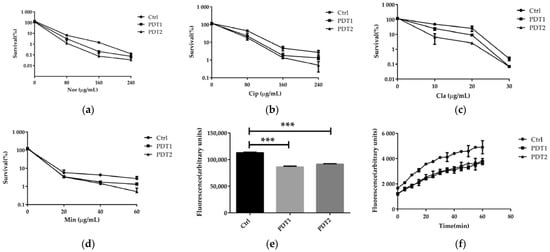 Ctrl, PDT1, and PDT2 bacteria were collected and washed with 1×PBS buffer three times. The pellet was re-suspended in 7H9 medium, adjusted to OD600 of 0.4, followed by an addition of Nor: Norfloxacin 80, 160, 240 μg/mL, Cip: Ciprofloxacin 80, 160, 240 μg/mL, 10, 20, 30 μg/mL Cla: clarithromycin, 20, 40, 60 μg/mL and Min: Minocycline for 24 h pre-treatment. Bacterial suspensions were gradually diluted and treated bacteria were spread on 7H9 agar and incubated at 37 °C for 4 days.