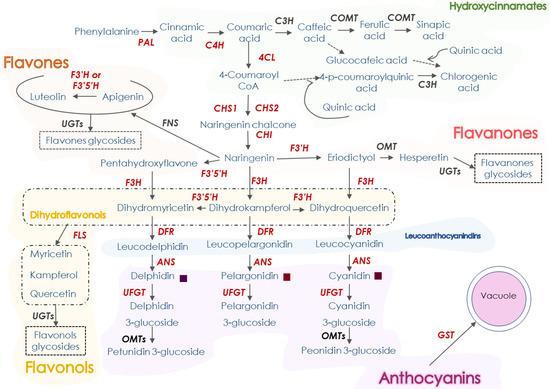 A schematic representation of the phenylpropanoid pathway. Red-bold labelled genes are those studied in this work. Gene names are abbreviated as follows: PAL, phenylalanine ammonia-lyase; C3H, p-coumarate 3-hydroxylase, C4H, cinnamate 4-hydroxylase; 4CL, 4-hydroxy-cynnamoyl CoA ligase; CHS, chalcone synthase; CHI, chalcone isomerase; COMT, caffeic acid 3-O-methyltransferase; FNS, flavone synthase; F3H, flavanone 3-hydroxylase; F3′H, flavonoid 3′-hydroxylase; F3′5′H, flavonoid 3′5′-hydroxylase; GST, glutathione-S- transferase; OMTs, O-methyltransferases; FLS, flavonol synthase; DFR, dihydroflavonol 4- reductase; ANS, anthocyanidin synthase; UFGT, uridine diphosphate-glucose:flavonoid 3-O-glucosyltransferase and UGTs, O-methyltransferase.