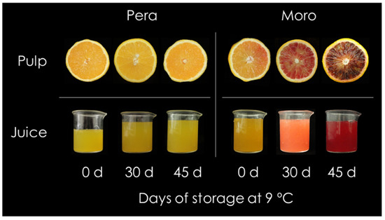 The effect of postharvest storage on fruit colour was determined in two different cultivars of Citrus sinensis L. Osbeck, Moro (blood type) and Pera (blond type) mature fruits (8 months after the bloom). Fruits were harvested from adult trees grown (13 years old) and grafted on citrumelo Swingle under standard cultivation in a commercial orchard in Maringá (21°45′53″ S; 48°28′21.15″ O, 540 m), Gavião Peixoto-Sao Paulo State (Brazil). The local climate is Cwa type (mountain subtropical), characterised by dry winter (<1230 mm total rainfall of the year) and a normal average air temperature of ≥17 °C and ≥28 °C in the coldest and in the warmest month, respectively [37]. Maringá soil type is classified as latossolo vermelho (Red-oxisol), dystrophic A moderate type, and soft-moderately wavy relief [38]. A total of 80 fruits were harvest from 15 trees planted at 7.0 m × 3.0 m spacing. Fruits were uniform in size and colour, as well as free of damage or external defects. Harvested fruits were stored for 45 days at 9 °C, and 90–95% relative humidity in constant darkness. At the time of harvest (zero) and after 15, 30 and 45 days of storage, pulp and juice samples were taken and stored at −80 °C until analysis. Three replicate samples of 5 fruits each per storage time were used. Pulp was separated with a scalpel, and immediately frozen in liquid nitrogen and ground into a fine powder. Juice was extracted with a domestic squeezer (Braun GmbH, Germany), filtered through a metal sieve with a pore size of 0.8 mm and frozen in liquid nitrogen.