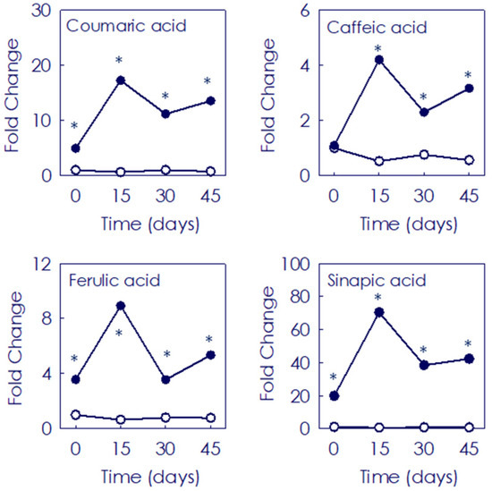 Fold change of the 4 main hydroxycinnamic acids identified in the pulp of Moro (●) and Pera (○) oranges during storage for 0, 15, 30 and 45 days. Data are expressed as the mean fold change ± SD of each sample as compared to the control Pera fruits sample (at harvest time). Asterisk indicates statistically significant different values (p ≤ 0.01) for each given time point when comparing cultivars.