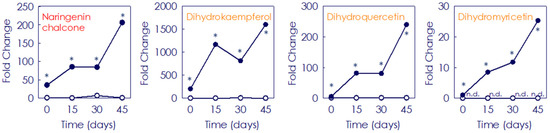 Fold change of naringenin chalcone (flavonoids precursor, in red colour) and the dihydroflavonoids (anthocyanins precursors, in orange colour) dihydrokampherol, dihydroquecetin and dihydromyricetin in the pulp of Moro (●) and Pera (○) oranges during storage for 0, 15, 30 and 45 days. Data are expressed as the mean fold change ± SD of each sample compared to the control Pera fruits sample (at harvest time). Asterisk indicates statistically significant different values (p ≤ 0.01) for each given time.