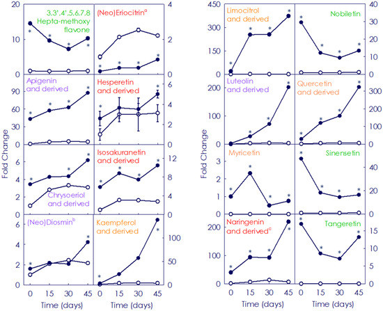 Fold change of representative flavonoids identified in the pulp of Moro (●) and Pera (○) oranges during storage for 0, 15, 30 and 45 days. Compounds belonging to flavanones class are represented in red colour, flavonols class in orange and the flavones in purple and light green (polymethoxyflavones subgroup). a. Sum of eriocitrin and neoeriocitrin. b. Sum of diosmin and neodiosmin. c. Including the naringenin chalcone. Data are expressed as the mean fold change ± SD of each sample compared to the control Pera fruits sample (at harvest time). Asterisk indicates statistically significant different values (p ≤ 0.01) for each given time.