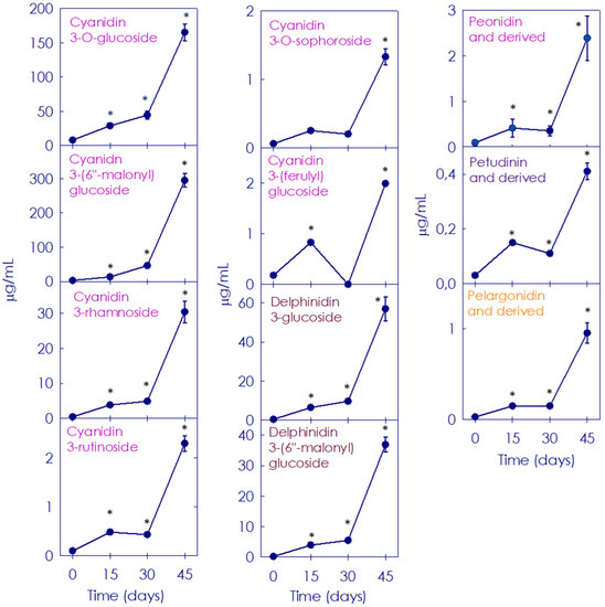 Composition of anthocyanins in the pulp of Moro blood orange during storage for 0, 15, 30 and 45 days. Data are expressed as the mean ± SD of each sample as compared to the control sample (Moro fruit at harvest time). Asterisk indicates statistically significant different values (p ≤ 0.01) for each given time.
