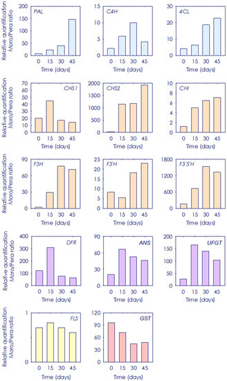 Ratio of the relative expression of phenylalanine ammonia-lyase (PAL), cinnamate 4-hydroxylase (C4H), 4-hydroxy-cynnamoyl CoA ligase (4CL), chalcone synthases 1 and 2 (CHSs), chalcone isomerase (CHI), flavonoid 3-hydroxylase (F3H), flavonoid 3’5’-hydroxylase (F3’5’H), flavonol synthase (FLS), dihydroflavonol 4-reductase (DFR), anthocyanidin synthase (ANS), uridine diphos-phate-glucose:flavonoid 3-O-glucosyltransferase (UFGT) and glutathione-S-transferase (GST) in the pulp of Moro vs. Pera oranges during storage for 0, 15, 30 and 45 days. Blue, and orange bars indicate genes involved in the general phenypropanoids and flavonoids, respectively. Yellow and purple bars indicate genes involved in the flavonols and anthocyanins biosynthesis, respectively. Red bars belong to those genes involved in the anthocyanin transport.