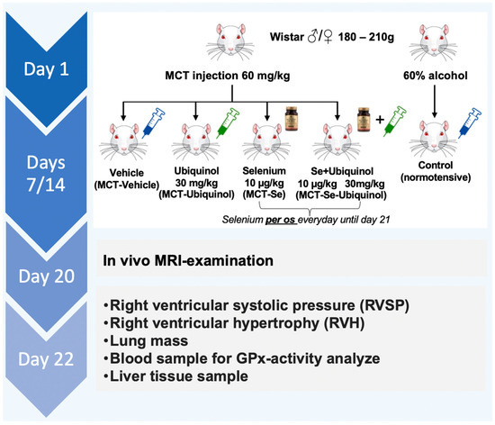 On day 7, the Wistar rats were randomized into groups (n = 10♂/12♀ in each group): the MCT-Ubiquinol group receiving into the tail vein 1% of solubilized ubiquinol (RU2635993-C1) at a dose of 30 mg/kg (composition (1 mL) ubiquinol 10 mg, macrogol glycerol ricyl oleate 80 mg, polysorbate 40 mg, ascorbic acid 1 mg, sodium EDTA 0.5 mg, sodium chloride 0.9% ad 1 mL); the MCT-Vehicle group receiving vehicle for the ubiquinol substance (the same composition, but without ubiquinol, i.e., it was the control group to ubiquinol administration); the MCT-Se group receiving intragastric administration of selenium at a dose of 10 µg/kg (100 µg, Solgar, Leonia, NJ, USA) and the MCT-Se-Ubiquinol group receiving the combination of ubiquinol and selenium powder. The control group of healthy rats was also injected with a vehicle without ubiquinol. The intravenous administration of substances was repeated on day 14, the intragastric administration of selenium powder was performed daily over a period of 14 days. Since the MCT-Ubiquinol and MCT Se-Ubiquinol groups of male rats did not reveal any significant increase in lung mass, the subsequent experiment on female rats involved MRI of lungs on day 20 to detect fibrotic and unventilated regions and check the assumption of the ubiquinol influence. On day 22, the hemodynamic parameters (mean arterial pressure, heart rate, right ventricle systolic pressure were estimated through a catheter directly, venous blood was preserved; after that the animals were sacrificed by cerebral dislocation method, the morphometric study of the internal organs was performed and part of the liver was preserved. The scheme of time and manipulations is shown in Figure 1.