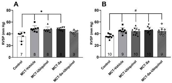 Right ventricle systolic pressure (RVSP) in male rats (A) and female rats (B) on day 21 of the experiment (mean ± SD). (A) Male rats * Control vs. MCT-Vehicle, MCT-Ubiquinol, MCT-Se, p < 0.01, (B) Female rats # Control vs. MCT-Vehicle, MCT-Ubiquinol, MCT-Se, MCT-Se-Ubiquinol, p < 0.05, one-way ANOVA.