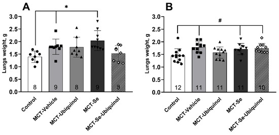 Lung mass in male rats (A) and female rats (B) on day 21 of the experiment (mean ± SD). Male rats * Control vs. MCT-Vehicle, MCT-Se, p < 0.05, female rats # Control vs. MCT-Vehicle, MCT-Se, MCT-Se-Ubiquinol, p < 0.05, one-way ANOVA.