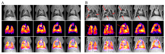 MRI of two rats without (A) and with (B) lung fibrosis: selected slices of 1H (top rows) and 19F (middle rows) MRI in coronal projection, as well as their overlaying (bottom rows). The red arrows point to fibrotic changes in the lungs.