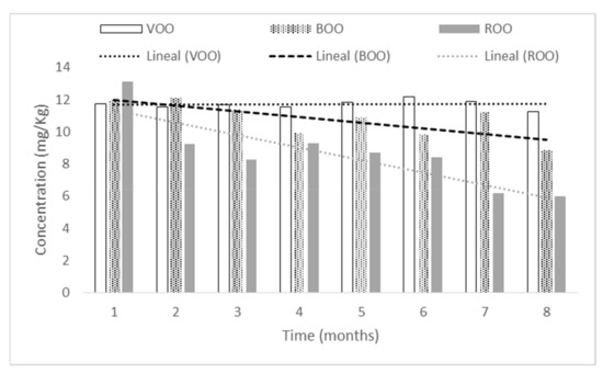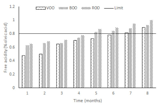 Free acidity (FA) is by far the most implemented criteria for qualifying virgin olive oil categories. Figure 1 shows that FA increased during the storage of the three sets of samples (VOO, ROO, BOO) in a linear trend from below to above 0.8, which is the maximum value for EVOOs. This may come as a surprise in filtered EVOOs, but it is less strange in veiled EVOO var. Manzanilla because of the progressive hydrolysis of the triacylglicerides in unfiltered oils [24]. Thus, the control samples (VOO) reached a value above 0.8 in the seventh month, when this usually may occur in commercial EVOOs after the “best before” date, around one and half or two years after bottling. Fortunately, it does not automatically imply any increase in the oxidation process of the oil or a decrease of its total phenol content.