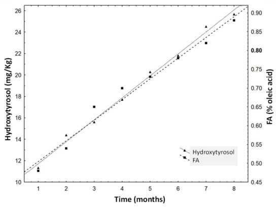 The four oleuropein-derivate compounds changed significantly (p < 0.05) in the control samples (VOO) during the experiment: hydroxytyrosol and 3,4-DHPEA-EA increased their concentrations while the concentration of 3,4-DHPEA-EDA and hydroxytyrosol acetate diminished. Hydroxytyrosol is the last derivative that is generated in the oxidation and hydrolysis processes of the oleuropein-derivates, and many works have reported that its concentration increases in oxidation processes [29]. Figure 2 shows that hydroxytyrosol concentration increased linearly (R2 = 0.97) in the storage experiment of VOOs. The concentrations of hydroxytyrosol and the FA were well correlated (R2 = 0.93), as can been deduced from Figure 2. This correlation is a consequence of the fact that free fatty acids, and partially hydroxytyrosol, result from hydrolysis.