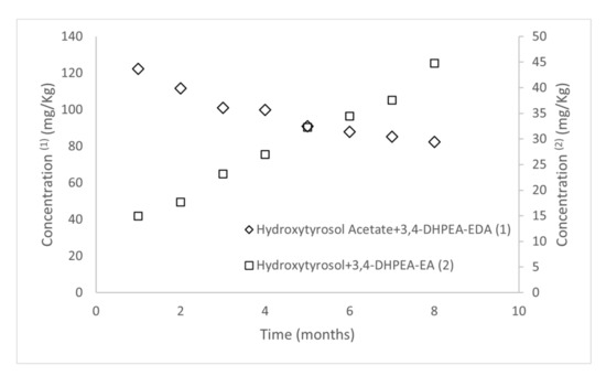 With respect to the profiles of those derivatives from oleuropein and ligstroside throughout storage, the concentrations of 3,4-DHPEA-EDA diminished in a linear manner up to 32.83% from the initial value. Conversely, the increase of the concentrations of hydroxytyrosol was partially possible because the dialdehyde degrades to it [13]. Additionally, there was a good relationship between the sum of the concentrations of hydroxytyrosol acetate and 3,4-DHPEA-EDA during the eight months of the experiment, as well as for the sum of the concentration of hydroxytyrosol and 3,4-DHPE-EA with the storage time. However, the relation between the two sums is inversely proportional, due to the degradation of 3,4-DHPEA-EDA and hydroxytyrosol acetate to hydroxytyrosol and 3,4-DHPEA-EA, as displayed in Figure 3.