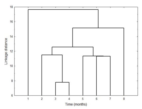 Figure 4 displays the result of applying a cluster analysis to control samples of the experiment, characterized with the full set of 15 phenols. The result is a chronological classification of the phenolic profiles determined throughout storage, the initial profile being quite different from all the rest. In fact, the phenolic profiles of the first and the last months were different from the two basic groups, in which the rest of the profiles clustered chronologically. Profiles of the fifth, sixth and seventh months were different but with some common information, as can be deduced from Figure 4. They were different from the third and fourth months, which were similar to each other, and different from the profile corresponding to the second month.