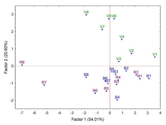 Factor 1 also shows a similitude between the order of the position of VOO samples in the PCA and in the cluster analysis of Figure 4. This sequence of samples is also observed in the samples of BOO and ROO, pointing out that there is a great similarity between the three groups, in particular at the beginning, probably because the migration of phenols from plant and herb had just started. Thus, the sector of Figure 6 that corresponds to the values of the X-axis (Factor 1) from 4 to 2 displays that the samples of the first month (VOO-1, BOO-1 and ROO-1) are clustered together. Next can be seen the samples of the second month, VOO-2, BOO-2 and ROO-2, though ROO-2 is in between samples from the first two months. Samples from the third and fourth month are in the sector constituted by the values 1 and 0 of Factor 1, leaving the negative values of Factor 1 to classify the samples of the sixth to eighth month, when there was an increase of the oxidation products.