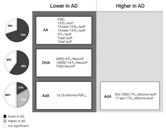 First, PGs, IsoPs and IsoFs come from AA oxidation. However, PGs are inflammatory molecules, which are formed following the cyclooxygenase metabolic pathway and are associated with cognitive impairment [6,30].