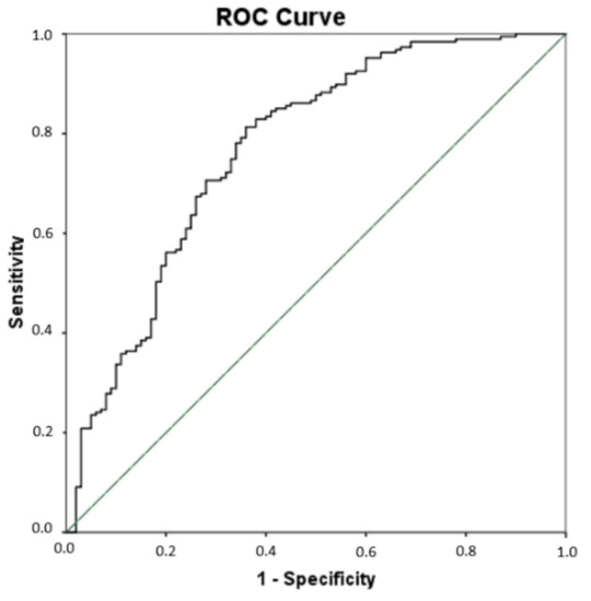 Since significant differences were found for some lipid peroxidation compounds (PGE2, 15-E2t-IsoP, 15-keto-15-E2t-IsoP, 15-keto-15-F2t-IsoP, 5-F2t-IsoP, total IsoPs, total IsoFs, 4(RS)-4-F4t-NeuroP, 10-epi-10-F4t-NeuroP, 14(RS)-14-F4t-NeuroP, total NeuroPs, total NeuroFs, 1a,1b-dihomo-PGF2α, Ent-7(RS)-7-F2t-dihomo-IsoP) among all groups of participants, a multivariate PLS analysis was carried out that included all these compounds simultaneously, to assess their utility in the AD differential diagnosis. As result, the sensitivity was 81.3%, the specificity was 64%, the accuracy was 75.3%, the positive predictive value was 81% and the odds ratio was 7.72 (see Table 5). Figure 2 depicts the corresponding ROC curve developed from the PLS model. The corresponding cut-off value was 0.619.