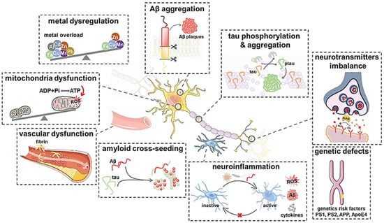 Different plausible Alzheimer’s disease mechanisms of Aβ aggregation, tau phosphorylation and aggregation, neurotransmitters imbalance, genetic defects, neuroinflammation, amyloid cross-seeding, vascular dysfunction, mitochondria dysfunction, and metal dysregulation [31]. “Reprinted from [31] “A mechanistic survey of Alzheimer’s disease” Biophysical Chemistry 2022, 281, 106735, (2022), with permission from Elsevier”.