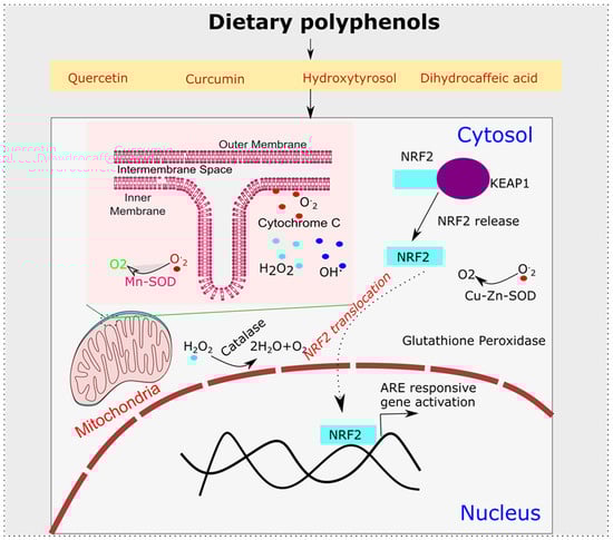 Dietary Polyphenols’ Anti-Oxidative Mechanism. Mostly dietary polyphenols’ basic mechanism of action involves their role as antioxidant which can be achieved by modulating NRF2-KEAP1 antioxidant response pathway or through modulation of antioxidant enzyme, such as SOD (Superoxide Dismutase), Catalase and Glutathione peroxidase.