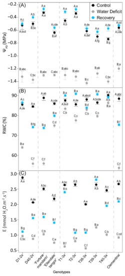 Plant water status parameters of 2x and 3x genotypes under three water treatments: 70–100% pot capacity (black point, control), 45–55% pot capacity (grey points, water deficit), and five days after re-watering (blue point, recovery). (A) Pre-dawn water potential (ΨPD), (B) relative water content (RWC), and (C) transpiration rate (E). All data are mean values (± S.E.) of 3 independent measurements for ΨPD (n = 3) and 15 independent measurements for RWC and E (n = 15). Data were analyzed with ANOVA and Fisher’s LSD test (p < 0.05). Uppercase letters compare water treatments for each genotype. Lowercase letters compare genotype within the same water treatment.