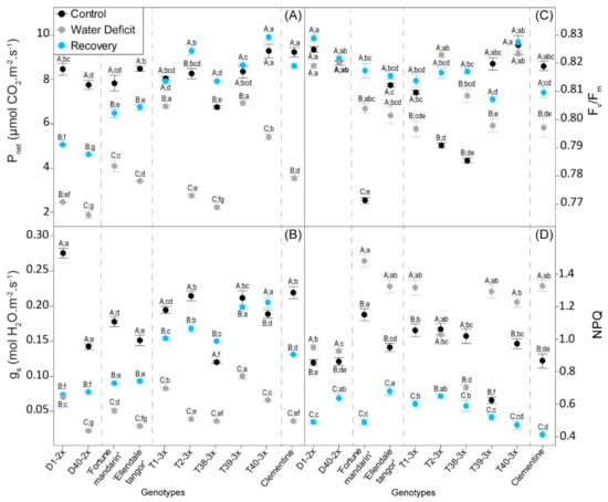 Leaf physiological parameters of 2x and 3x genotypes under three water treatments: 70–100% pot capacity (black point, control), 45–55% pot capacity (grey points, water deficit), and five days after re-watering (blue point, recovery). (A) Net photosynthesis (Pnet), (B) stomatal conductance (gs), (C) maximal quantum yield of PSII (Fv/Fm), and (D) non-photochemical quenching (NPQ) rate. All data are mean values (±S.E.) of 15 independent measurements (n = 15). Data were analyzed with ANOVA and Fisher’s LSD test (p < 0.05). Uppercase letters compare water treatments for each genotype. Lowercase letters compare genotype within the same water treatment.