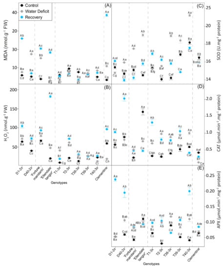 Under stressful conditions, antioxidant processes play a crucial role in maintaining a balance between ROS accumulation and detoxification in order to limit oxidative stress-related damages. In our study, increased specific SOD activity found in 3x genotypes and Ellendale tangor was related to low MDA levels and thus the limitation of the lipid peroxidation process (Figure 3A). In contrast, rise in SOD activity was also reported in Fortune mandarin but appeared insufficient to limit MDA accumulation during water deficit (Figure 3 and Figure 5). CAT and APX both help to limit H2O2 accumulation in various cell compartments []. Increased APX and CAT activities reported in most of the 3x genotypes appeared sufficient to prevent oxidative damage by reducing H2O2 accumulation (Figure 3B). Increased SOD and APX activities were also observed in clementine grafted onto tetraploid Carrizo citrange under natural chilling stress []. In the same way, stronger APX and CAT activities were recorded in triploid Persian lime, which favored the oxidative stress-induced HLB limitation []. Moreover, these authors reported that CAT activity was the key marker that differentiate the triploid Persian lime from 2x Mexican lime under HLB stress.
