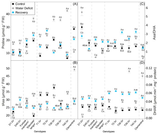 After the re-watering, a sharp drop in proline content was reported in most of genotypes, while Fortune mandarin, clementine, and T2-3x showed an increase in response to rehydration. Slight significant differences of tAsa content were observed between genotypes at the recovery period, while an increase in Asa/DHA ratio was reported in most of genotypes, and highest values were found in T38-3x and T40-3x. A sharp rise of DHAR activity was observed after re-watering in all genotypes (except T39-3x and clementine), and the highest value was found in the T2-3x genotype.