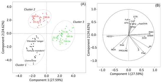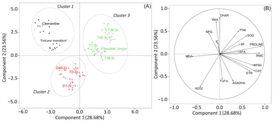 Physiological and biochemical parameters monitored under water deficit and after the re-watering were subjected to PCA. Figure 5 depicted the response to water deficit where the two first components explained 52.21% of the total variability. Proline and RWC were positively correlated with component 1, and only MDA was negatively correlated with component 1. Protective mechanisms in terms of tAsa, DHAR, and NPQ were positively correlated with component 2, while H2O2, Fv/Fm, and Asa/DHA were negatively correlated with component 2. The discriminant analysis characterized the genotypes in three distinct clusters (1–3). Cluster 1 (Clementine and Fortune mandarin) and cluster 2 (diploid genotypes and T2-3x) were differentiated from cluster 3 (3x genotypes and Ellendale tangor) by lower proline and RWC content and enhanced oxidative damages (MDA and H2O2 content). Cluster 2 was also characterized by less protective mechanisms (NPQ, tAsa content, and DHAR activity) in comparison with Cluster 1.