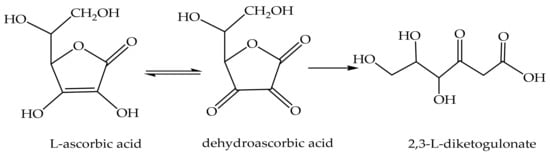 Vitamin C, also known as L-ascorbic acid, is a water-soluble vitamin used in skincare and skin lightening products such as antioxidants, skin repair, and connective tissue repair [119,120]. It, especially when exposed to air, oxidizes to dehydroascorbic acid and hydrolyzes to form 2,3-L-diketogulonate (at alkaline pH) [121] (Figure 1).