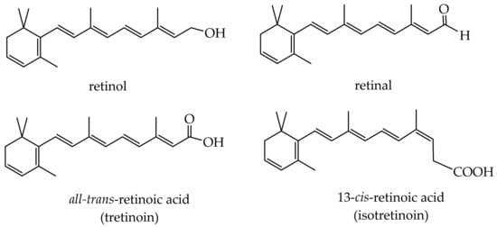 - Zasada, M.; Budzisz, E. Retinoids: Active molecules influencing skin structure formation in cosmetic and dermatological treatments. Postepy Dermatol. Alergol. 2019, 36, 392–397. [Google Scholar] [CrossRef] [Green Version]