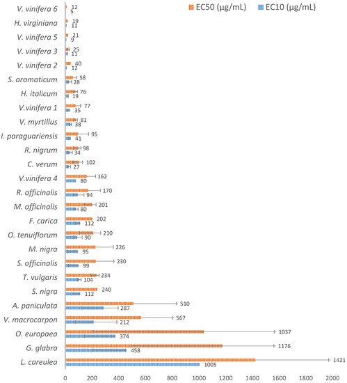 50s = 24.62 and 40.11 μg/mL and the leaf extract with EC
