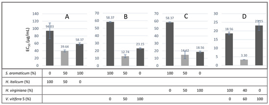 It is remarkable that the synergistic effects could be demonstrated both before and after intestinal transport for three combinations, namely S. aromaticum/H. italicum, S. aromaticum/H. virginiana and S. aromaticum/V. vinifera. The present study provides the first demonstration of such effects. For these four extracts taken individually, the direct and indirect antioxidant effects we observed here are in line with previously published data.