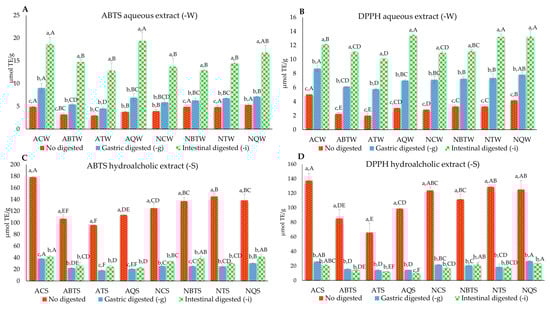 Antioxidant activity of aqueous (A,B) and hydroalcoholic (C,D) GP extracts before and after simulating the gastric (-g) and intestinal (-i) digestion. Data are expressed as mean values ± standard deviation (SD). Different lower-case letters indicate significant differences among the same extracts versus different samples (p < 0.05, one-way ANOVA and Tukey’s HSD test). Capital letters indicate a significant difference (p < 0.05, one-way ANOVA and Tukey’s HSD test) when comparing different GP samples against the same conditions (undigested, gastric-digested, or intestinal-digested). For sample codes, see Table 1.