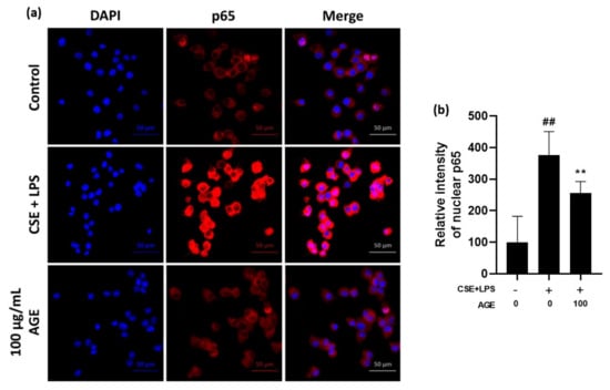 NF-κB and MAPK are involved in the transcriptional induction of pro-inflammatory mediators. In Figure 2f, IκBα in the cytosol was degraded in the CSE/LPS-stimulated MH-S macrophages, whereas IκBα degradation was attenuated in the AGE-treated macrophages in a dose-dependent manner. Quantitative data showed that the IκBα/β-actin ratio was higher in the AGE-treated macrophages than in the CSE/LPS-stimulated MH-S macrophages. In contrast, the expression of NF-κB p65 protein in the nucleus was increased in CSE/LPS-stimulated MH-S macrophages while the NF-κB p65/lamin B1 ratio was decreased in macrophages treated with AGE compared to CSE/LPS stimulated MH-S macrophages. Consistent with the Western blotting (Figure 2f), the increased fluorescence intensity of p65 observed in the nuclei of the CSE/LPS-stimulated MH-S macrophages was significantly reduced by treatment with 100 μg/mL of AGE, as shown in Figure 3a,b.