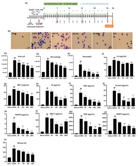Male BALB/c mice (5-weeks-old, 18–20 g) were purchased from Orient Bio (Gyeonggi, Korea). After a 1-week acclimation period, mice were randomly divided into the following six groups: the control group (Naïve, n = 10), the CSE/PPE-treated group (COPD, n = 15), CSE/PPE and 50 mg/kg AGE-treated group (AGE 50, n = 10), CSE/PPE and 100 mg/kg AGE-treated group (AGE 100, n = 10), CSE/PPE and 200 mg/kg AGE-treated group (AGE 200, n = 10), and CSE/PPE and 2.5 mg/kg dexamethasone-treated group (DEX, n = 10), as the positive control. To induce COPD, mice were intranasally treated with 20 μL of CSE (100%) and PPE (1.8 U/Head) from days 7 to 35, three times a week, and once every 2 weeks, respectively. The COPD group and 50, 100, and 200 AGE groups were orally administered 200 μL/mouse of PBS and AGE diluted in PBS from days 0 to 35. In the DEX group, 200 μL/mouse of dexamethasone diluted in PBS was orally administered from days 7 to 35, three times a week, to consider side effects such as body weight loss, insomnia, and depression [,], before treatment with CSE and PPE. The mice were sacrificed on day 36. Blood, lung tissue, and BALF were collected for further analyses. All animal procedures were carried out in accordance with the guidelines for animal use and care of the Korea Food Research Institute (approval number:KFRI-M-20028) Animals were maintained in the same room under conventional conditions, with a regular 12 h light/dark cycle, and temperature and relative humidity maintained at 23 ± 2 °C and 50 ± 5%, respectively. Mice were allowed free access to food and water.