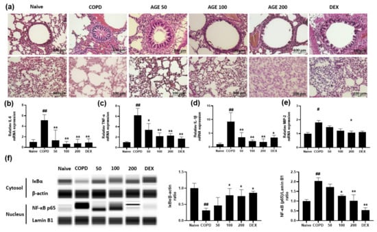 From the lung tissues of each group, the histopathology, pro-inflammatory cytokines and chemokines and their mechanisms were investigated. The main features of COPD are airway inflammation, enlargement, and destruction leading to airflow limitation. As described in Figure 5a, the lung tissues of the Naive group did not display airway inflammation or destruction of alveolar walls, and the size of the alveolar space was normal. However, CSE and PPE contributed to the deterioration of airway inflammation and the destruction and enlargement of alveolar space, which were observed in the COPD group. In the AGE group, these effects were attenuated. We demonstrated that AGE attenuated airway inflammation and alveolar enlargement in lung tissues. Inflammation involves the response to pro-inflammatory cytokines and chemokines. Figure 5b–e shows mRNA levels of IL6, TNFα, IL1β, and MIP2 in lung tissues. Similar to the in vitro results, these levels were increased in the COPD group and were markedly decreased in the AGE group. These results agreed with the protein levels of the cytokines and chemokines shown in Figure 4f–m and indicated that AGE suppresses the mRNA levels of pro-inflammatory cytokines and chemokines. As NF-κB signaling pathways are known to produce these proteins, the effects of AGE on the protein expression of IκBα and NF-κB p65 are shown in Figure 5f. The COPD group exhibited lower protein expression of IκBα in the cytosol, and NF-κB p65 in the nucleus was higher than that in the naïve group, but recovered in the AGE group. The levels of IκBα protein in the cytosol were markedly increased, and NF-κB p65 in the nucleus was significantly decreased in the AGE group. These results demonstrated that AGE can inhibit lung inflammation by suppressing the secretion of cytokines and chemokines via inhibiting NF-κB activation.