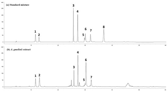High-performance liquid chromatography profile of standard mixture (a) and Artemisia gmelinii extract (b): (1) scopolin; (2) chlorogenic acid; (3) hyperoside; (4) scopoletin; (5) 3,4-di-O-caffeoylquinic acid; (6) 3,5-di-O-caffeoylquinic acid; (7) 4,5-di-O-caffeoylquinic acid; (8) scoparone.