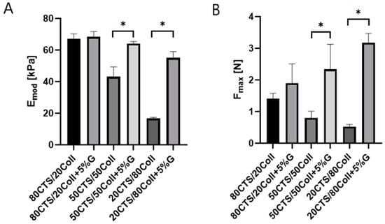 The compressive modulus (Emod) (A) and maximum force (Fmax) (B) obtained for the scaffold during the compression; * p < 0.001.