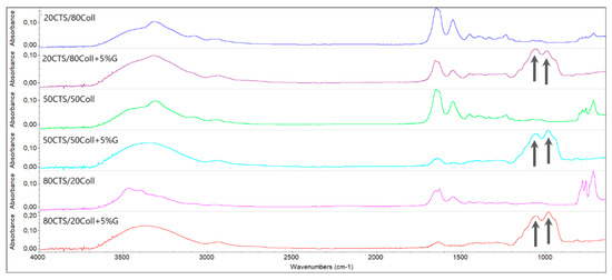 FTIR-ATR spectra obtained for all tested samples where the characteristic peaks are visible upon incorporation of 5% glyoxal (arrows).