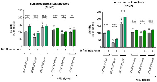 Namely, NHEK cultured on glyoxal-enriched scaffolds showed 14% and 24% enhancement for 50CTS/50Coll and 80CTS/20Coll, respectively, and a 36% drop for the 20CTS/80Coll sample. Similarly, proliferation of NHDF increased significantly by 10% (50CTS/50Coll) and 49% (80CTS/20Coll) against a 59% decrease of viability for 20CTS/80Coll. Finally, scaffolds containing 5% glyoxal and cultured cells in the presence of melatonin showed significant elevations of cell proliferation, indicating melatonin’s capacity towards skin re-epithelization.