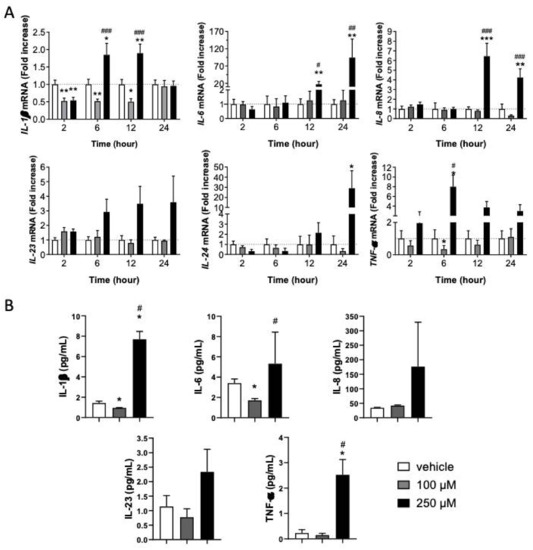 KC’s inflammatory response is dependent on the CinA concentration. KCs were exposed to 100 µM or 250 µM of CinA from 2 to 24 h. (A) The mRNA level of inflammatory cytokines IL-1β, IL-6, IL-8, IL23, IL-24, and TNF-α determined by RT-qPCR after 2–24 h of exposure to 100 and 250 µM of CinA and DMSO 0.1% as the vehicle control. (B) The inflammatory cytokines level was determined by Meso Scaled Discovery technology in the supernatant of KERTr after 24 h of exposure to 100 and 250 µM of CinA. Data represent the results of 3–14 independent experiments and are expressed as the mean ± SEM. (A,B) * Represents the statistical difference between CinA and vehicle-treated cells, and # represents the statistical difference between 100 µM and 250 µM-treated cells. *,# p-value < 0.05, **,## p-value < 0.01, and ***,### p-value < 0.001 (Mann–Whitney test).