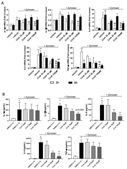 Low concentration of CinA controls zymosan-induced KC’s inflammatory response. KCs were exposed to different concentrations (25–100 µM) of CinA at the same time of the zymosan A (20 µg/mL) stimulation for 2, 6, and 24 h. (A) The mRNA level of inflammatory cytokines IL-1α, IL-1β, IL-6, IL-8, and TNF-α determined by RT-qPCR after 2 and 6 h of exposure to zymosan ± CinA (25, 50, or 100 µM) or DMSO 0.1% as the control. (B) Inflammatory cytokine levels determined by Meso Scaled Discovery technology in the supernatant of KERTr after 24 h of exposure to zymosan ± CinA (25, 50, or 100 µM). Data represent the results of 4–6 independent experiments and are expressed as the mean ± SEM. (A,B) * Represents the statistical difference between zymosan and vehicle-treated cells, # represents the statistical difference between zymosan ± CinA and zymosan-treated cells, $ represents the statistical difference between 50 or 100 µM and 25 µM of CinA and § represents statistical difference between 100 µM and 50 µM of CinA. *, #, $ p-value < 0.05 and **, ##, $$, §§ p-value < 0.01.